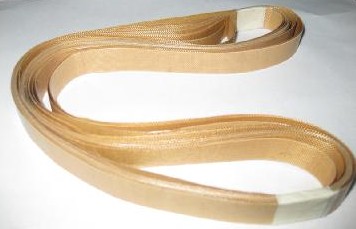 是采用PTFE鐵氟龍玻纖高溫布為基布,按照封口機機型固定的尺寸,進行剪裁加工而成的皮帶。由于封口機對皮帶的隔熱性要求極高,所以我們一般采用一層比較薄且隔熱性能好的高溫布來進行加工。它的缺點是,由于接頭磨損,使用壽命相對短一些,但價格最為便宜。